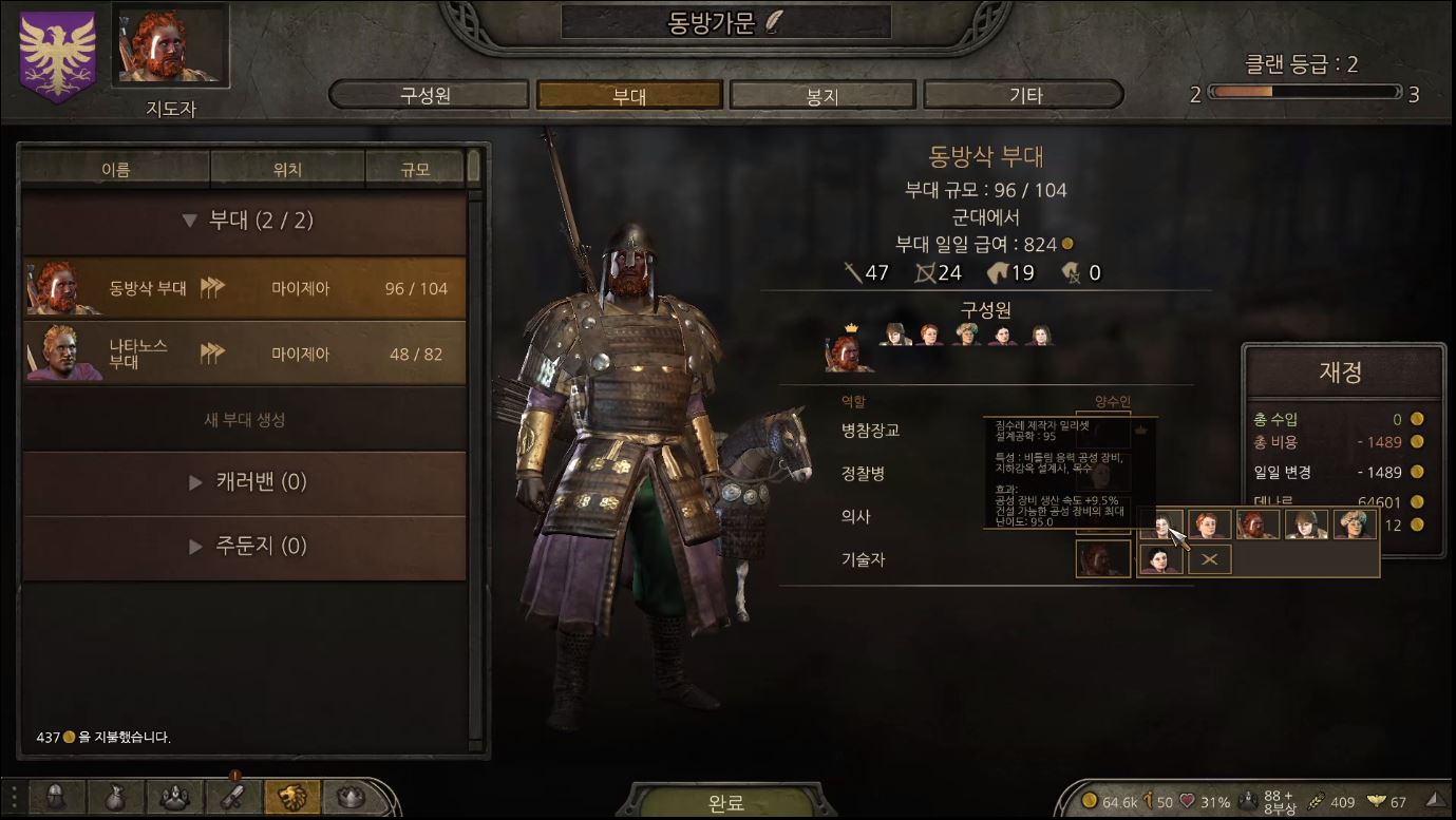 설계공학과 정찰은 아직 올릴 예정이 없으니 부대에서 쓸만한 능력치를 가진 동료에게 역할을 줍니다.