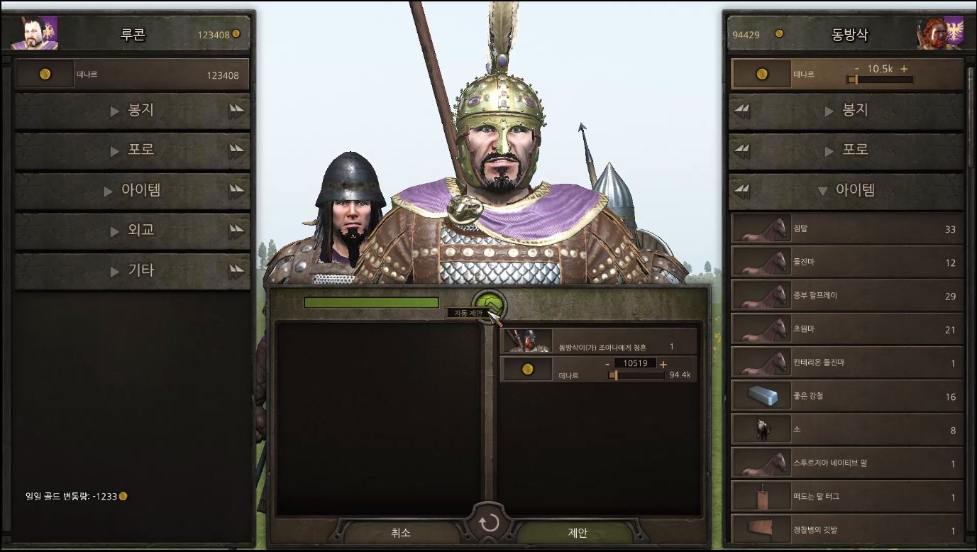 이후 거래창에서 자동제안을 누르면 약 1만 디나르를 지참금으로 내고 조아나를 아내로 맞이할수 있습니다.